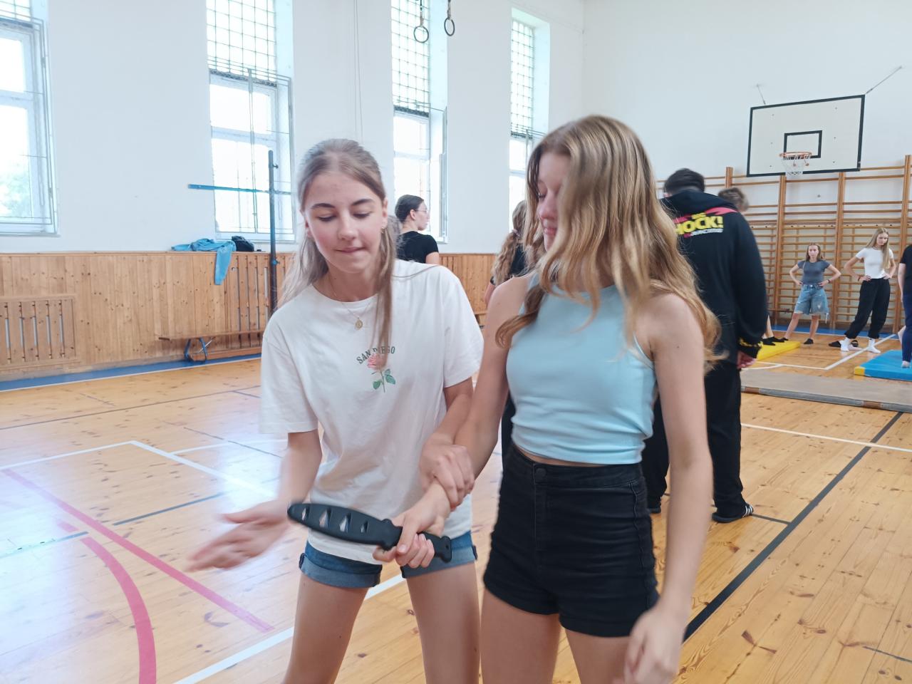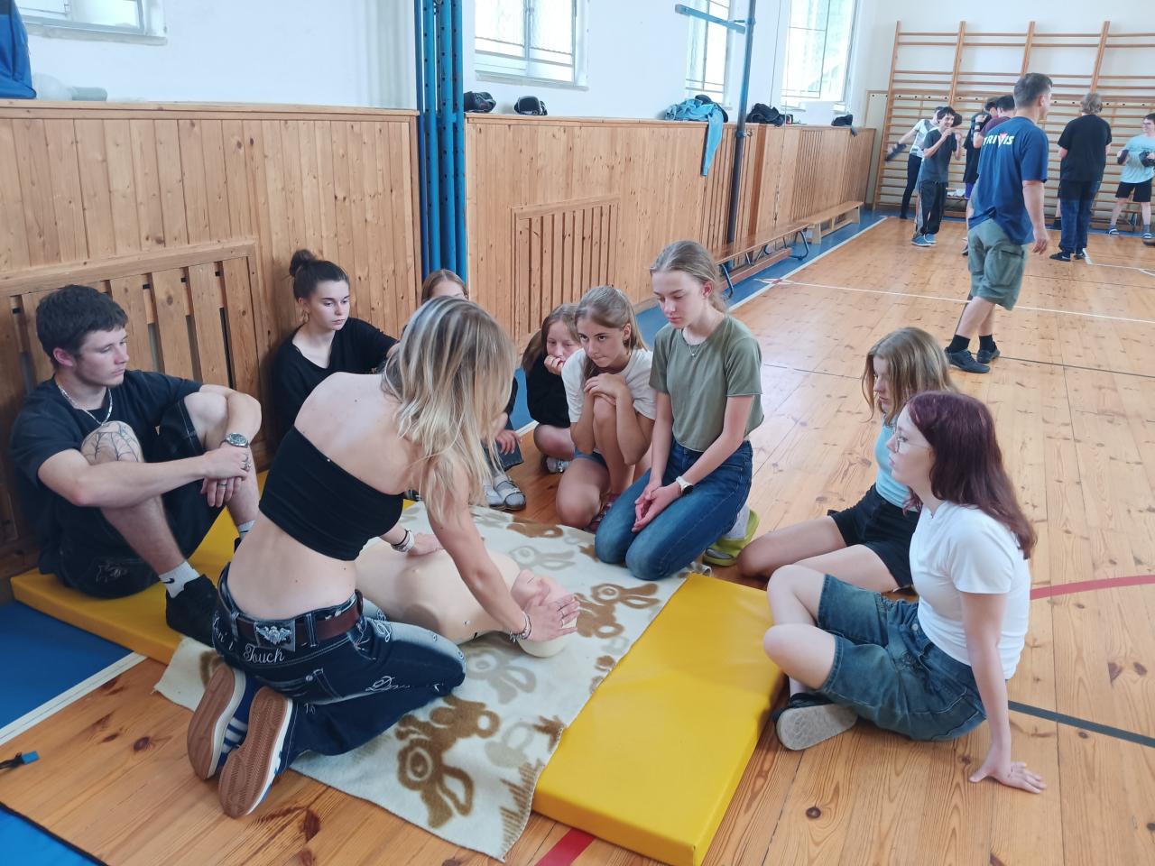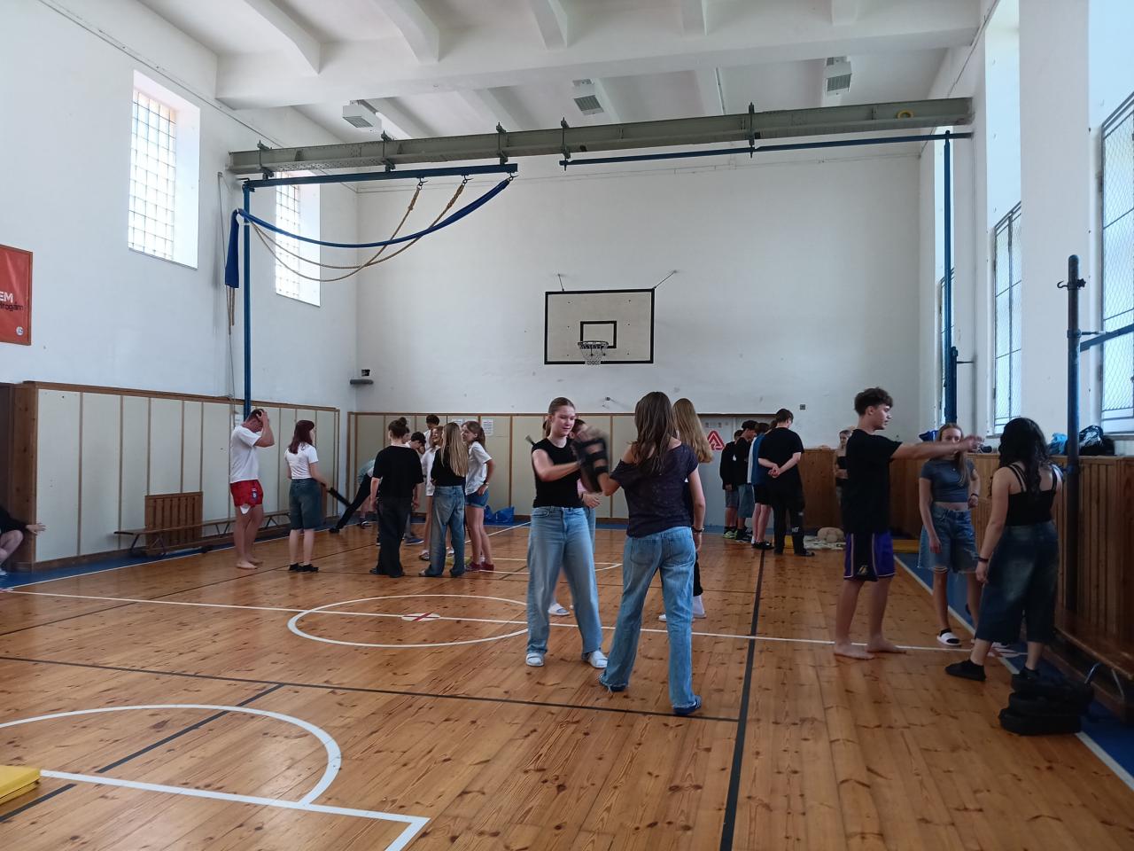 Po úvodním seznámení, které zahrnovalo základní informace o bezpečnosti a důležitosti správného postupu v náročných situacích, si žáci rozděleni do skupin vyzkoušeli různé stanoviště. Každé stanoviště bylo zaměřeno na jiný typ krizové situace, ve které si mohli vyzkoušet různé aspekty sebeobrany i pomoci druhým. Žáci se seznámili s tím, jak se bránit v situacích, kdy jsou vystaveni fyzickému útoku, a zároveň se učili, jak správně reagovat v případě zdravotních problémů, například při resuscitaci.