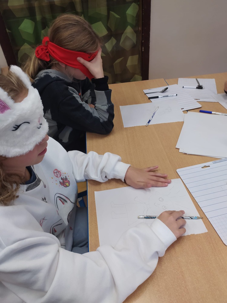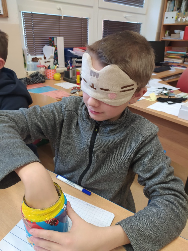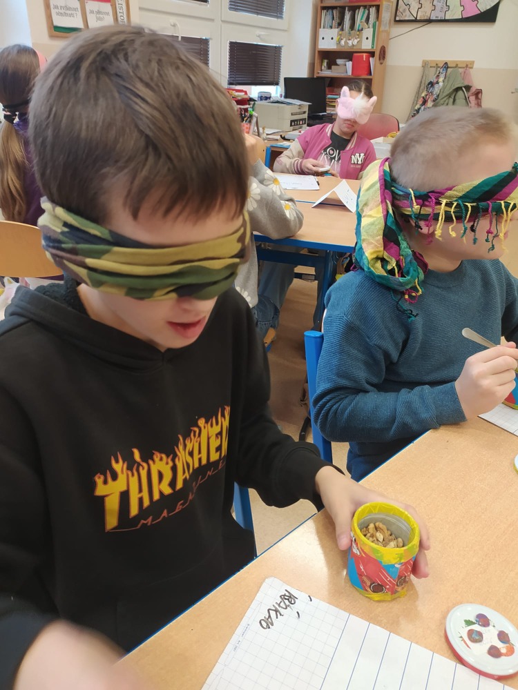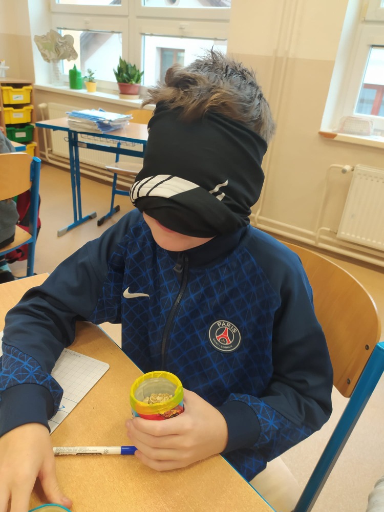 Ve třídě čekalo pět stanovišť, z nichž každé rozvíjelo jiný smysl. Děti čichaly, ochutnávaly, hmatem poznávaly předměty, kreslily poslepu a stavěly kostky podle puntíků, které musely nahmatat. Ukázalo se, že některé úkoly byly těžší, než se na první pohled zdálo, a že spoléhat jen na hmat či sluch vyžaduje soustředění i odvahu.