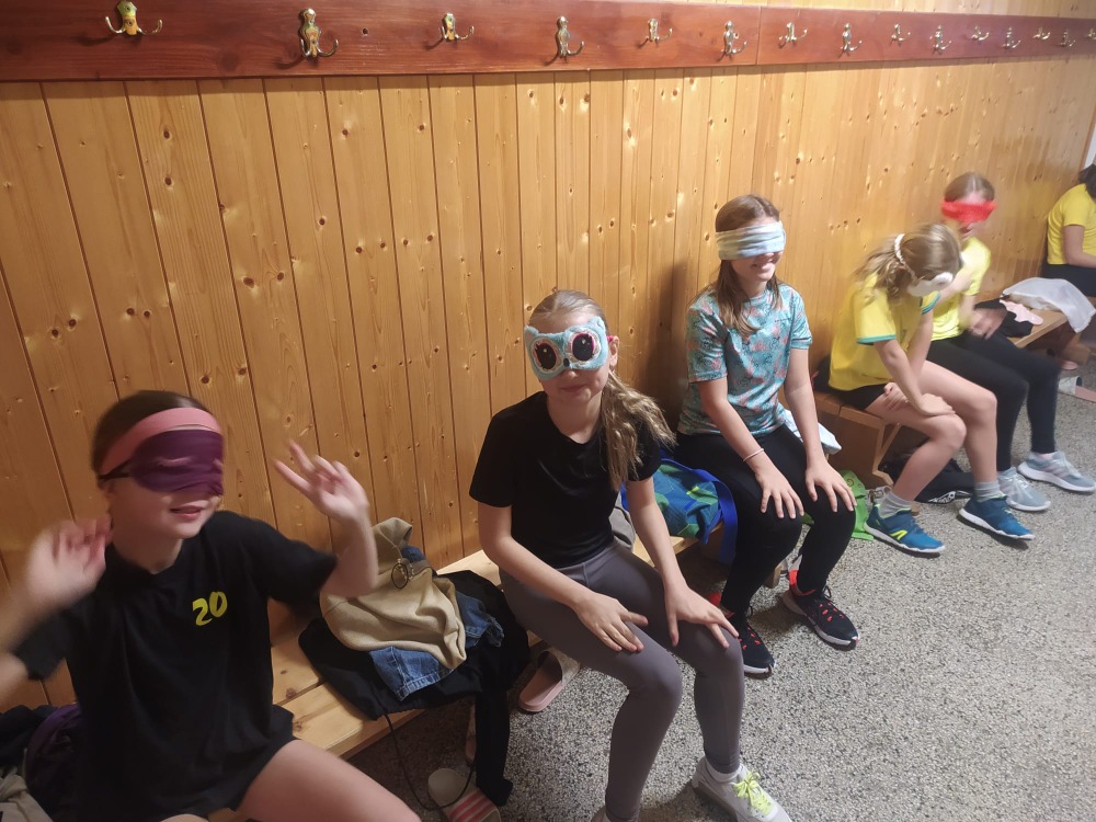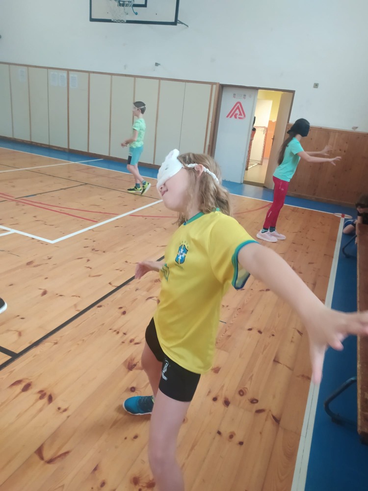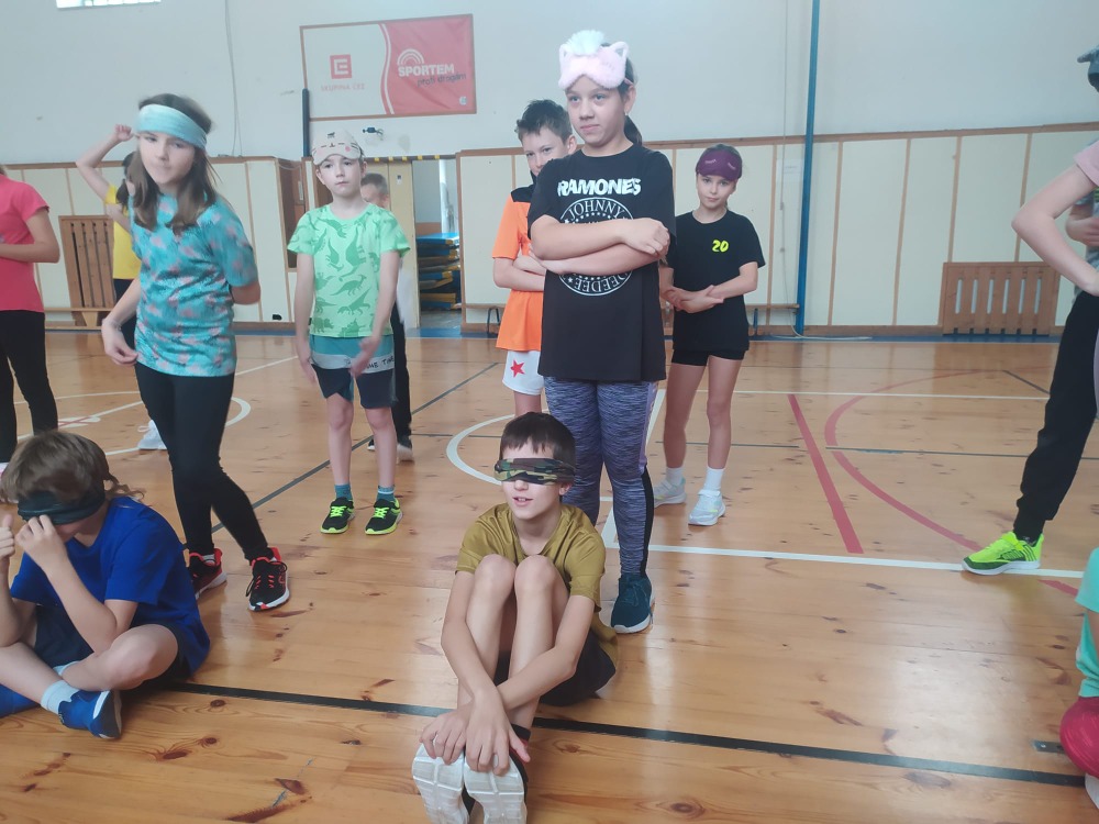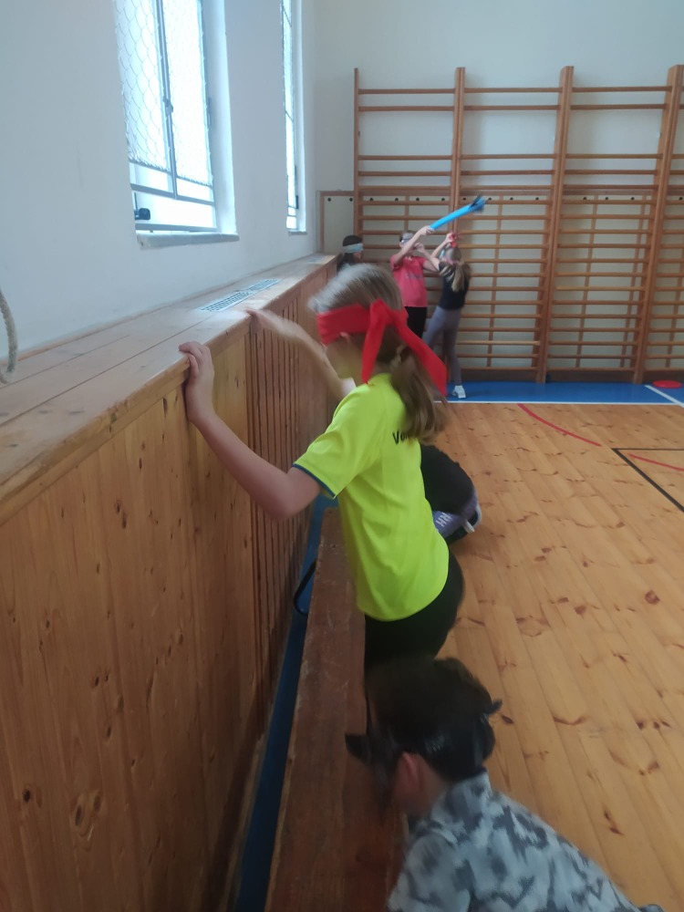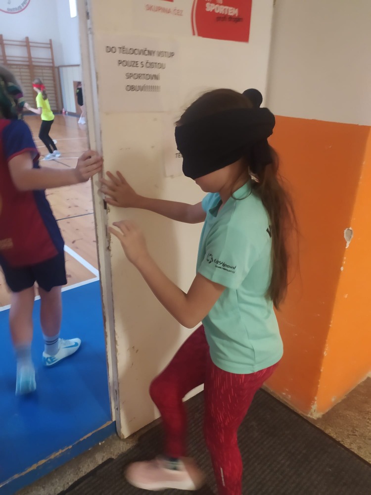 Poté jsme se přesunuli do tělocvičny, kde nás čekala praktická část dne. Se škraboškou na očích si žáci vyzkoušeli hledání předmětů, chůzi za zvukem a také pohyb se slepeckou holí. Mnozí si uvědomili, jak obtížné je odhadovat vzdálenost, směr či překážky, když člověk nevidí. O to větší úctu začali mít k těm, kteří se s touto realitou potýkají každý den.
