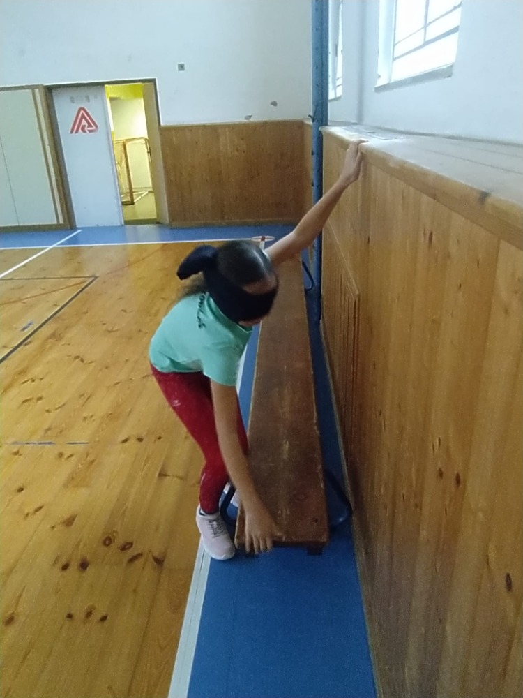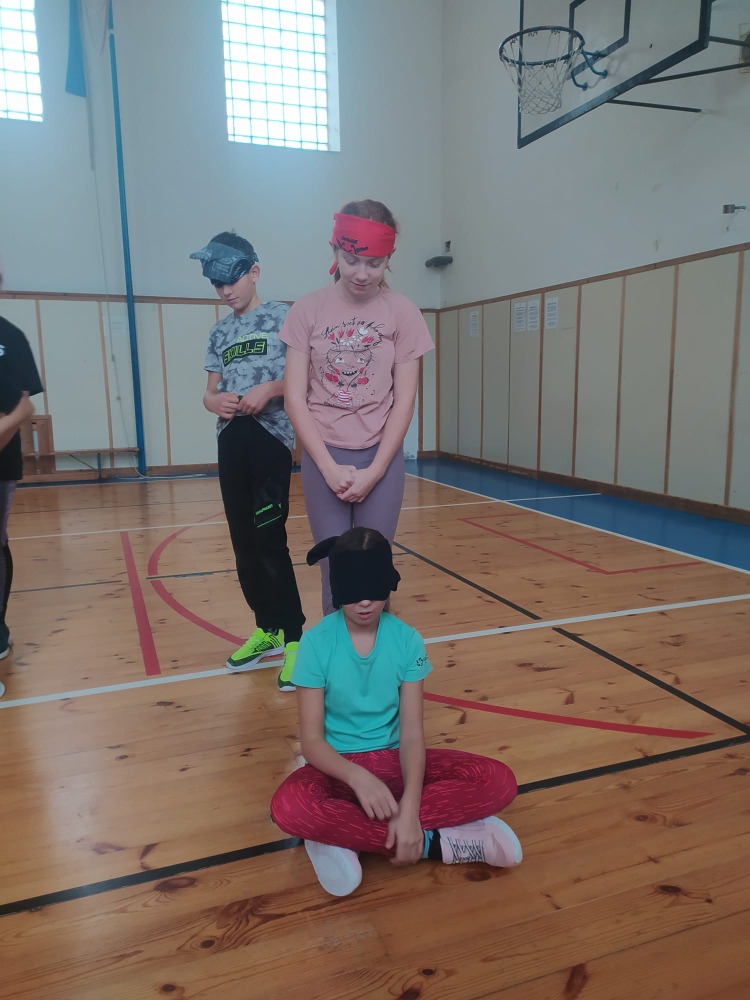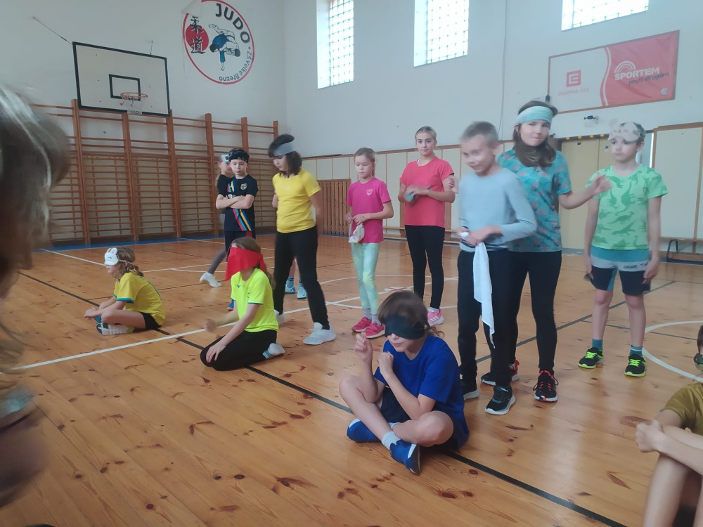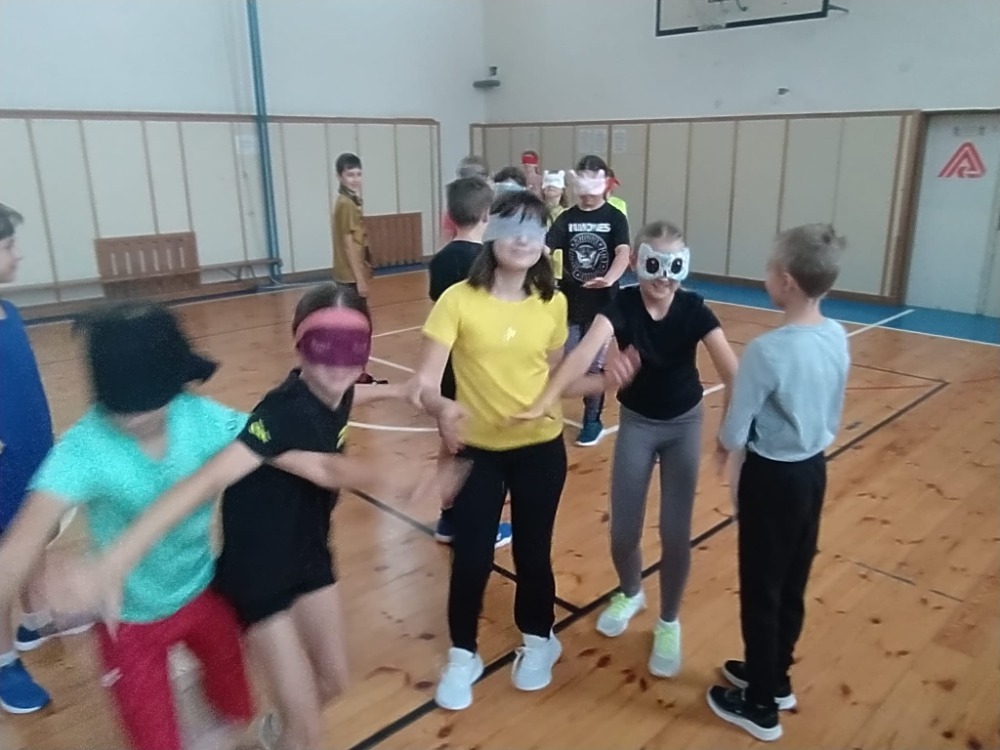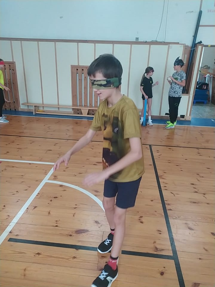 Poté jsme se přesunuli do tělocvičny, kde nás čekala praktická část dne. Se škraboškou na očích si žáci vyzkoušeli hledání předmětů, chůzi za zvukem a také pohyb se slepeckou holí. Mnozí si uvědomili, jak obtížné je odhadovat vzdálenost, směr či překážky, když člověk nevidí. O to větší úctu začali mít k těm, kteří se s touto realitou potýkají každý den.